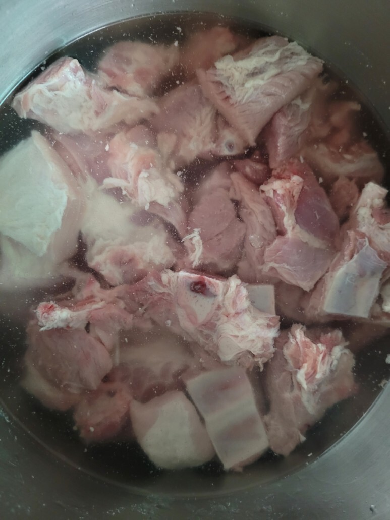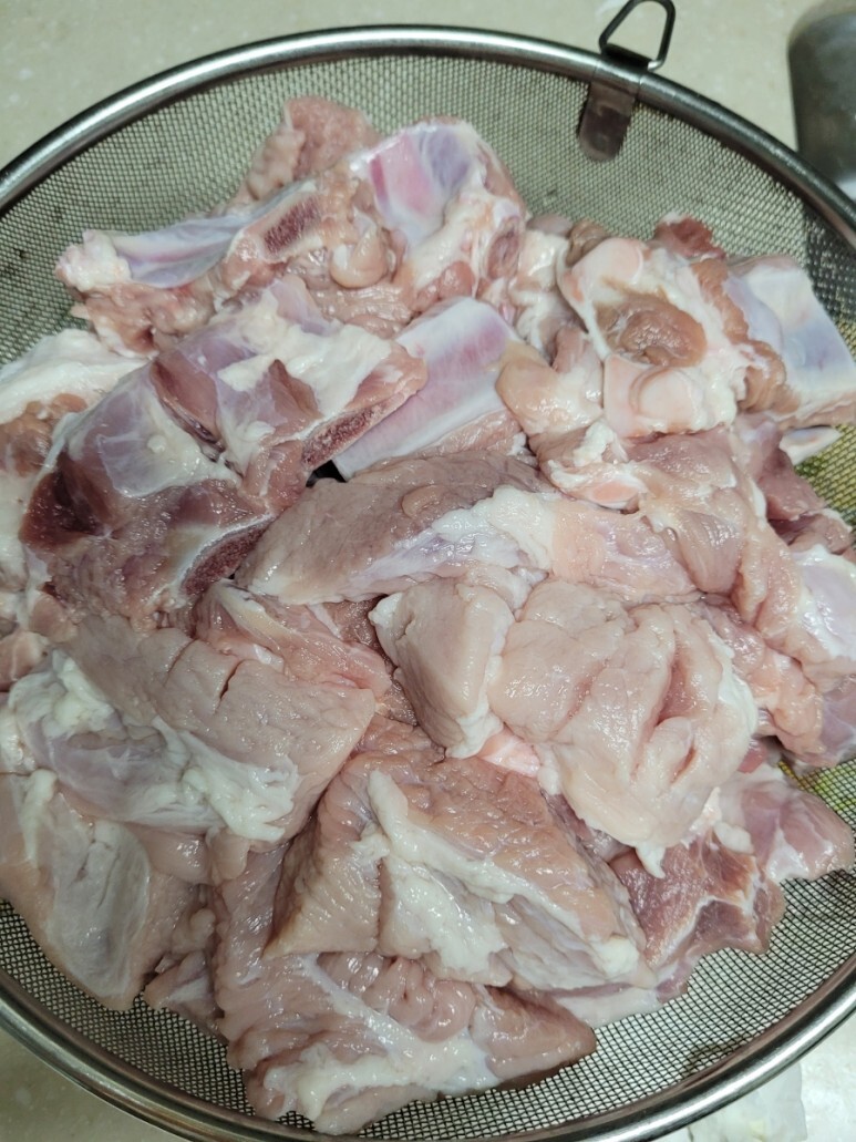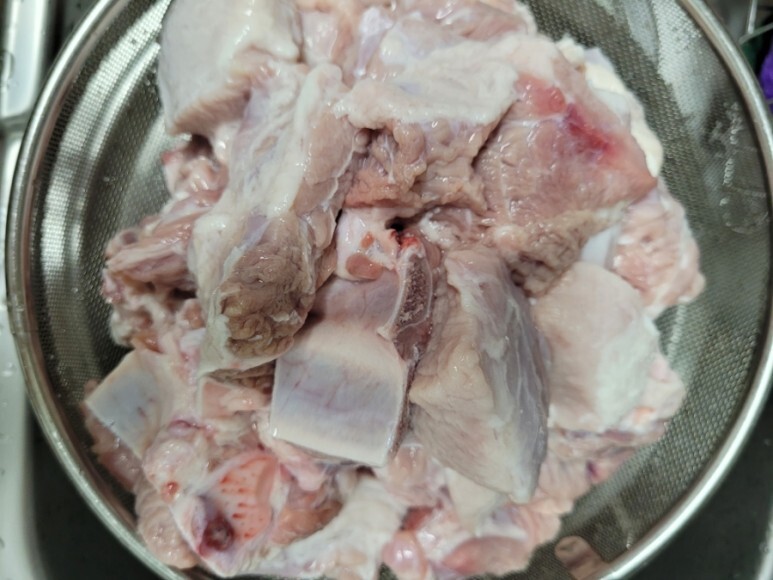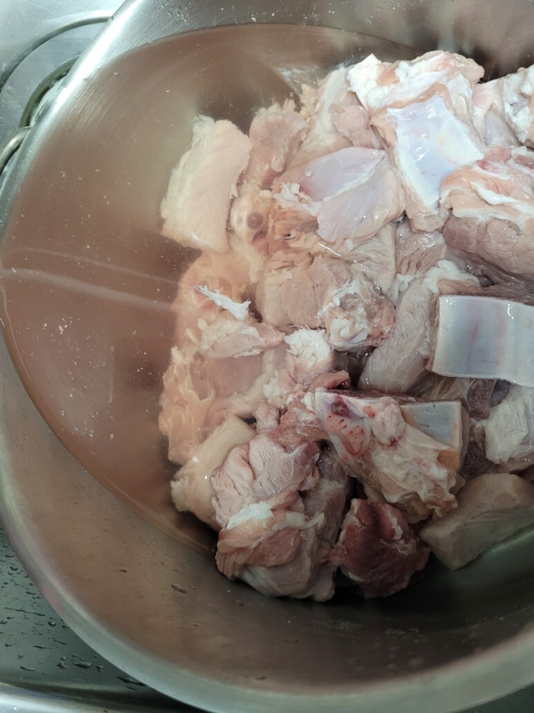 물에 담가 핏기를 제거 합니다(뚜껑있는 큰냄비를 사용하면 핏기제거하는 동안 이물질 침투를 막아줌)