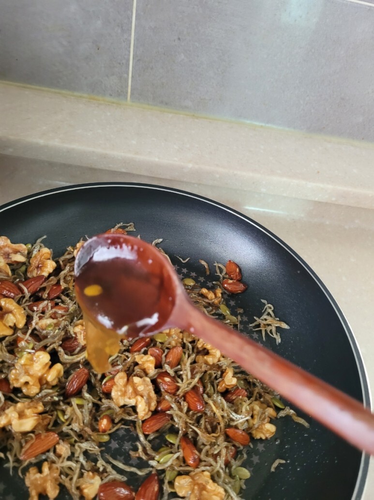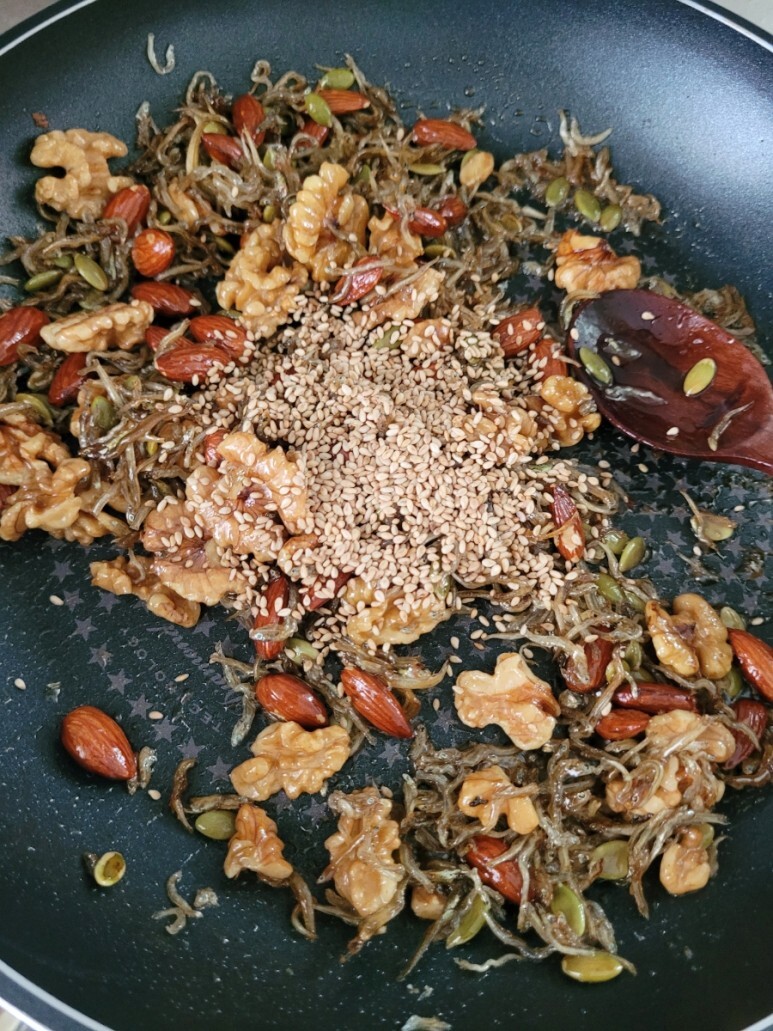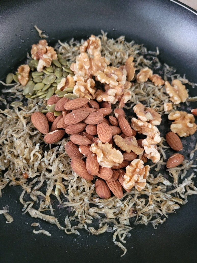 집에 있는 견과류를 골고루 넣어 멸치볶음을 해봤습니다. 멸치볶음인지 견과류볶음인지 헷갈리기도 합니다.